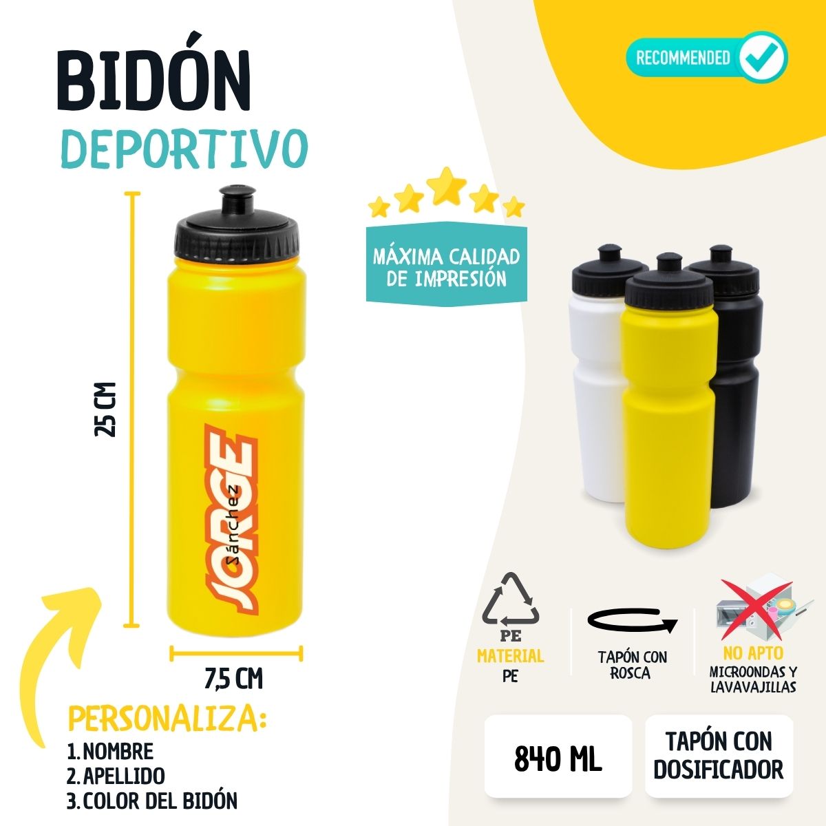 Uno de los grandes valores diferenciales de este producto es su personalización completa. Puedes añadir nombre, número o imagen, lo que convierte cada botella en una pieza única. Esta característica resulta especialmente útil en entrenamientos grupales, competiciones o salidas con amigos, ya que permite identificar el bidón de forma rápida y evitar confusiones. Además, la superficie de impresión es amplia, garantizando un resultado visible, duradero y de alta calidad.