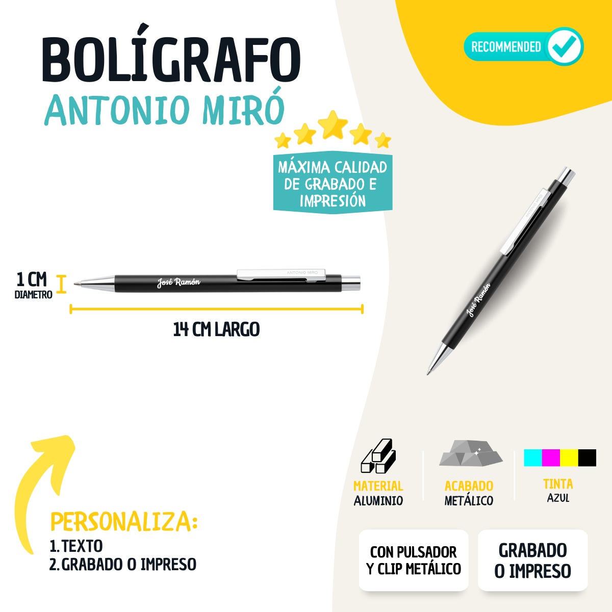 El bolígrafo metálico personalizado Antonio Miró es más que una herramienta de escritura: es un detalle con identidad, diseñado para usarse, conservarse y recordarse. Un equilibrio perfecto entre diseño, funcionalidad y personalización que deja huella en cada trazo.