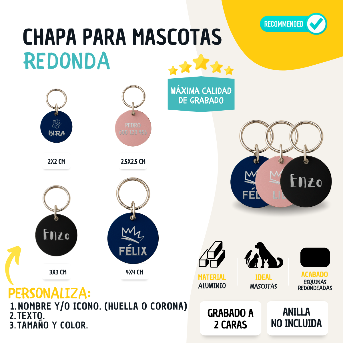 La chapa redonda personalizada para mascotas de DEREGALOOS es un accesorio esencial para garantizar la seguridad y rápida identificación de perros, gatos y otros animales como hurones. Diseñada para el uso diario, combina funcionalidad, resistencia y un diseño estético cuidado, convirtiéndose en una solución práctica y duradera para dueños responsables.