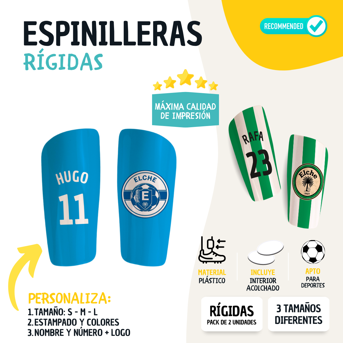 Las espinilleras DEREGALOOS son una excelente opción tanto para uso recreativo como competitivo, y también funcionan como regalo personalizado original para futbolistas jóvenes o adultos. Un producto funcional, moderno y configurable, pensado para quienes viven el fútbol con pasión y buscan accesorios que se adapten a su forma de jugar.