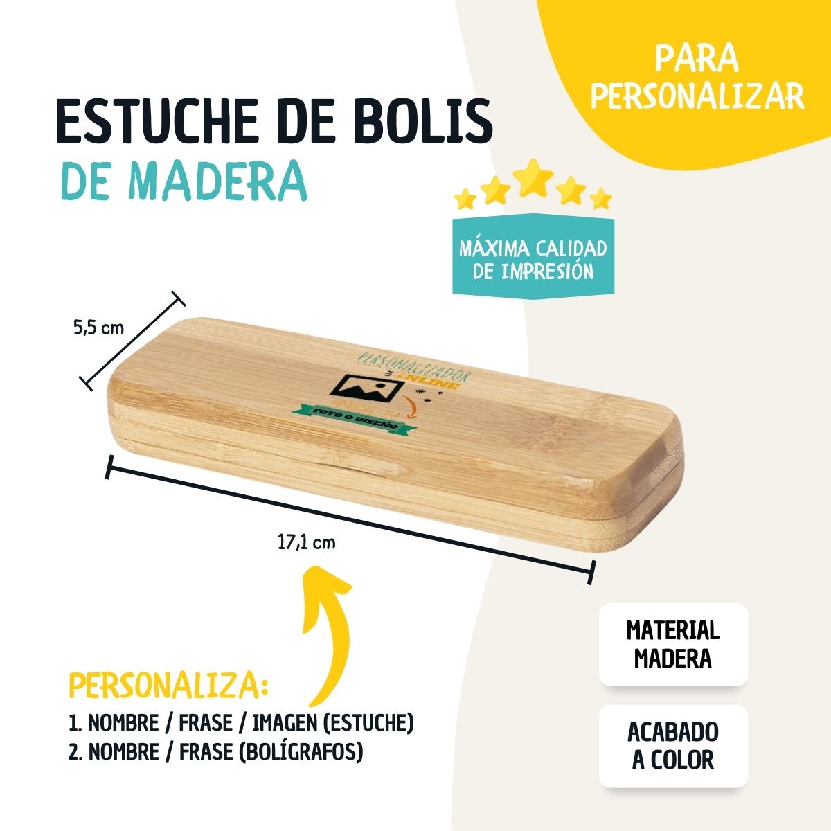 El estuche de bolígrafos personalizados de bambú es un regalo muy versátil. Resulta ideal como regalo para profesores, fin de curso, jubilaciones, graduaciones, Día del Padre, Día del Abuelo o como regalo corporativo para empresas que buscan un detalle elegante y personalizado. Su diseño neutro y natural encaja tanto en entornos profesionales como personales, convirtiéndose en un acierto seguro para cualquier ocasión especial.