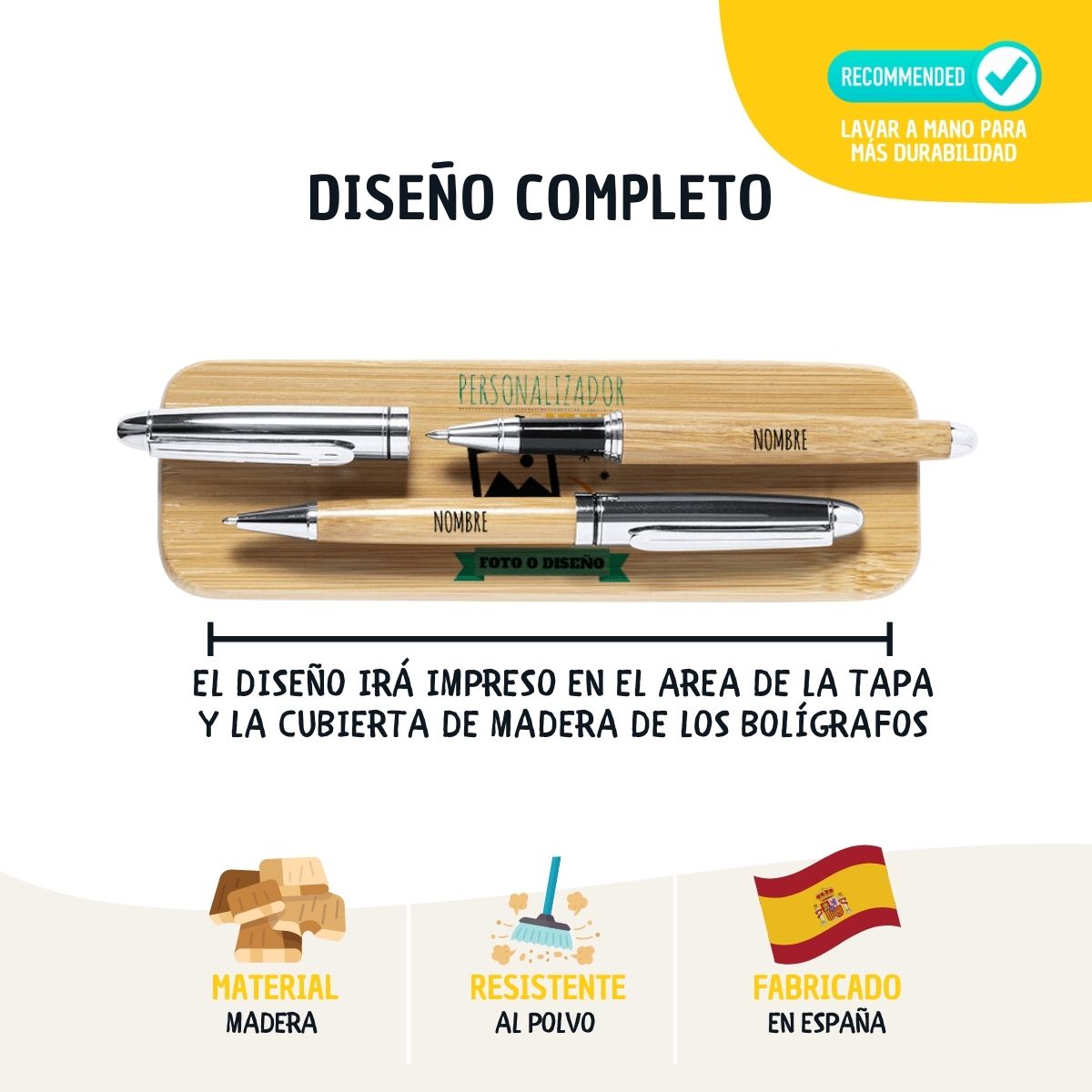 El estuche está fabricado en madera de bambú resistente, un material sostenible, duradero y agradable al tacto. Protege perfectamente los bolígrafos del polvo y del uso diario, convirtiéndose en un accesorio ideal para escritorios, oficinas, mochilas o maletines. Cada estuche es grabado cuidadosamente, garantizando un acabado preciso y elegante que realza el carácter artesanal y premium del producto.