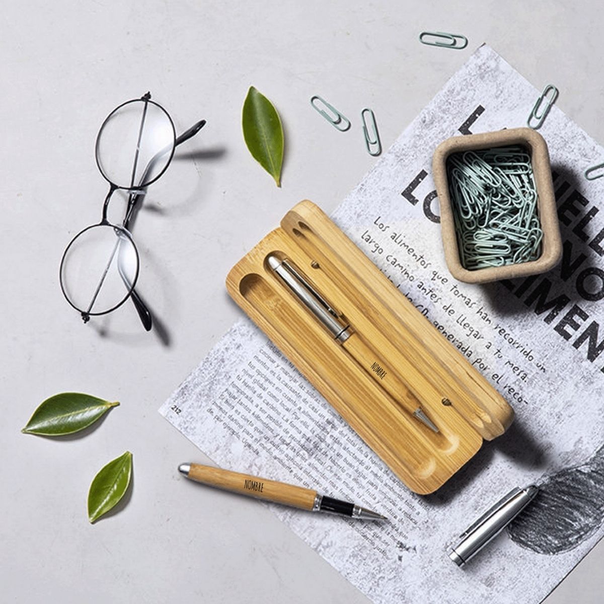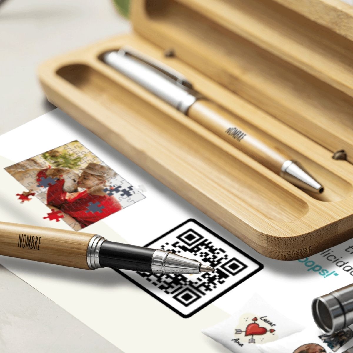 Es un regalo elegante, funcional y con un alto valor simbólico, pensado para quienes aprecian los detalles cuidados y los objetos útiles del día a día. Este set está compuesto por un estuche de madera de bambú de alta calidad y dos bolígrafos de bambú personalizados, creando un conjunto sofisticado que destaca tanto por su diseño natural como por su personalización exclusiva.