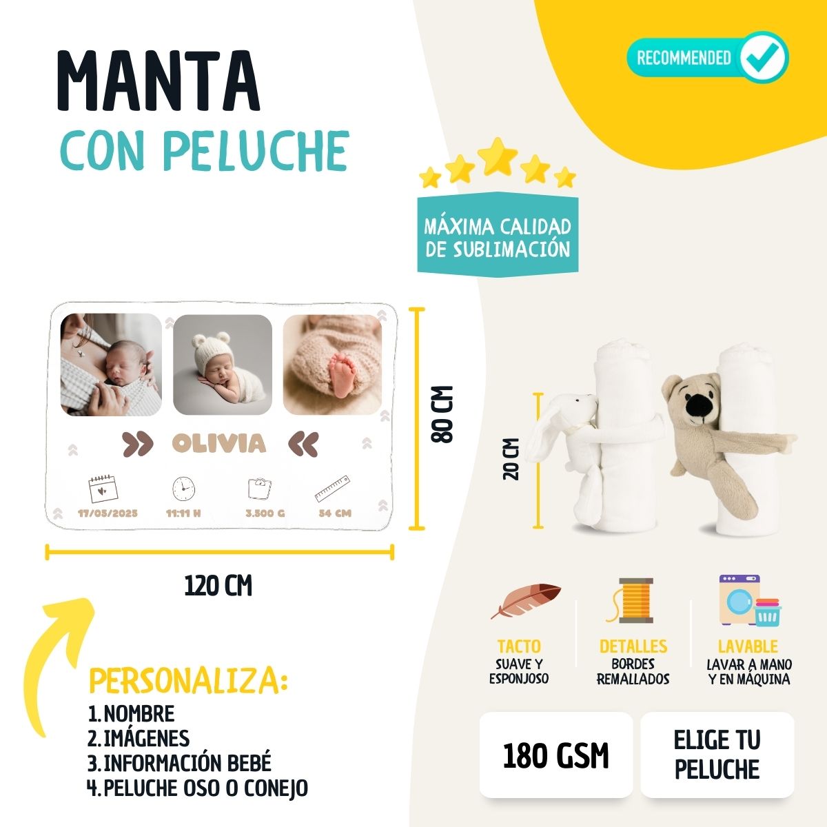 Manta Bebé Personalizada con Nombre | Incluye Peluche (Conejo u Osito) | Regalo Original para Bebés