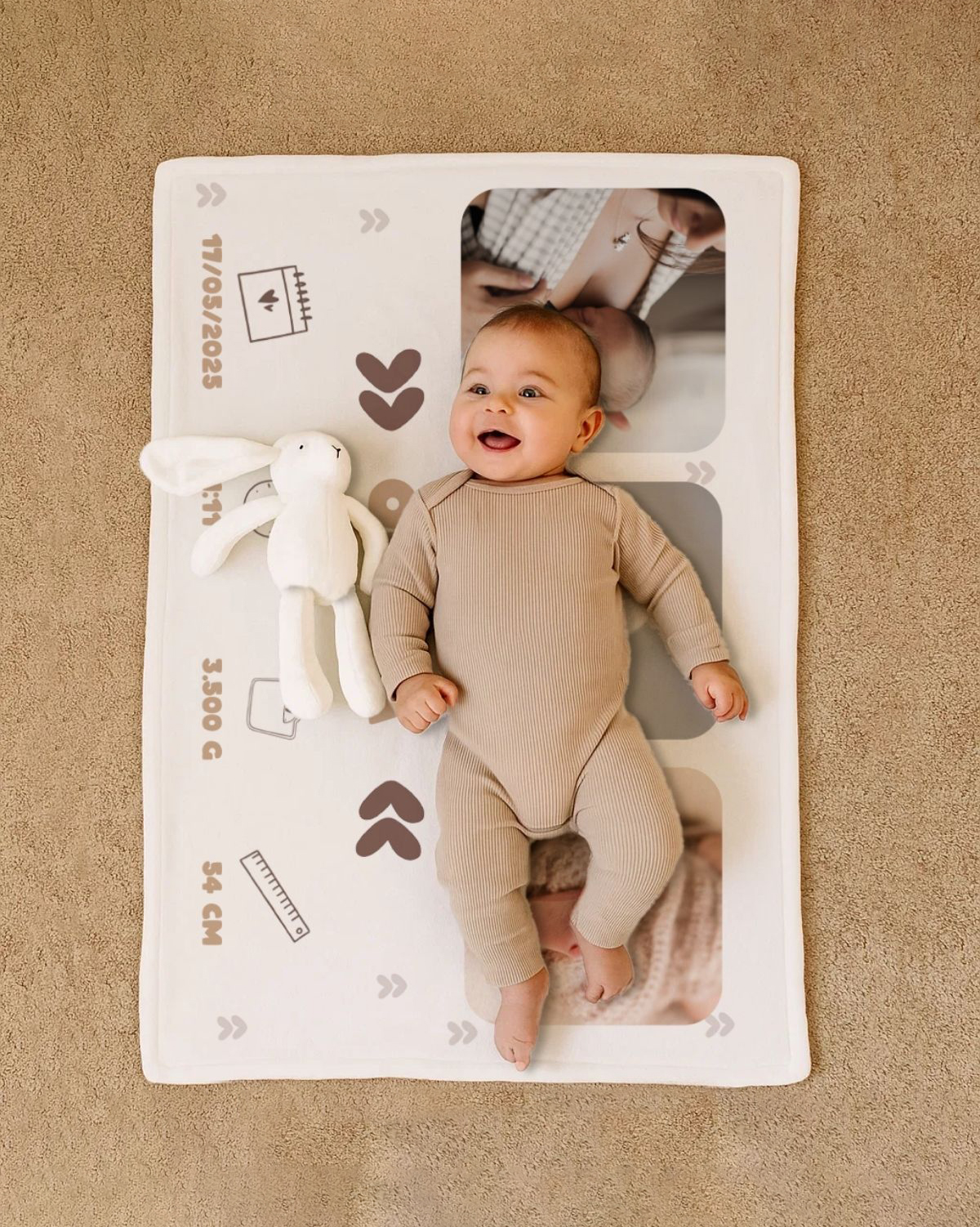 Uno de los grandes atractivos de esta manta es su personalización completa en una sola cara. Puedes elegir entre 5 diseños diferentes, todos pensados para adaptarse a distintos estilos y momentos especiales. Existen modelos con datos de nacimiento (nombre, fecha, peso y altura), diseños con fotos del bebé, opciones con arcoíris, ilustraciones de animalitos o incluso diseños con calendario mensual, ideales para hacer fotos mes a mes y seguir el crecimiento del bebé. Cada diseño se imprime con cuidado y calidad, logrando un acabado bonito y duradero.