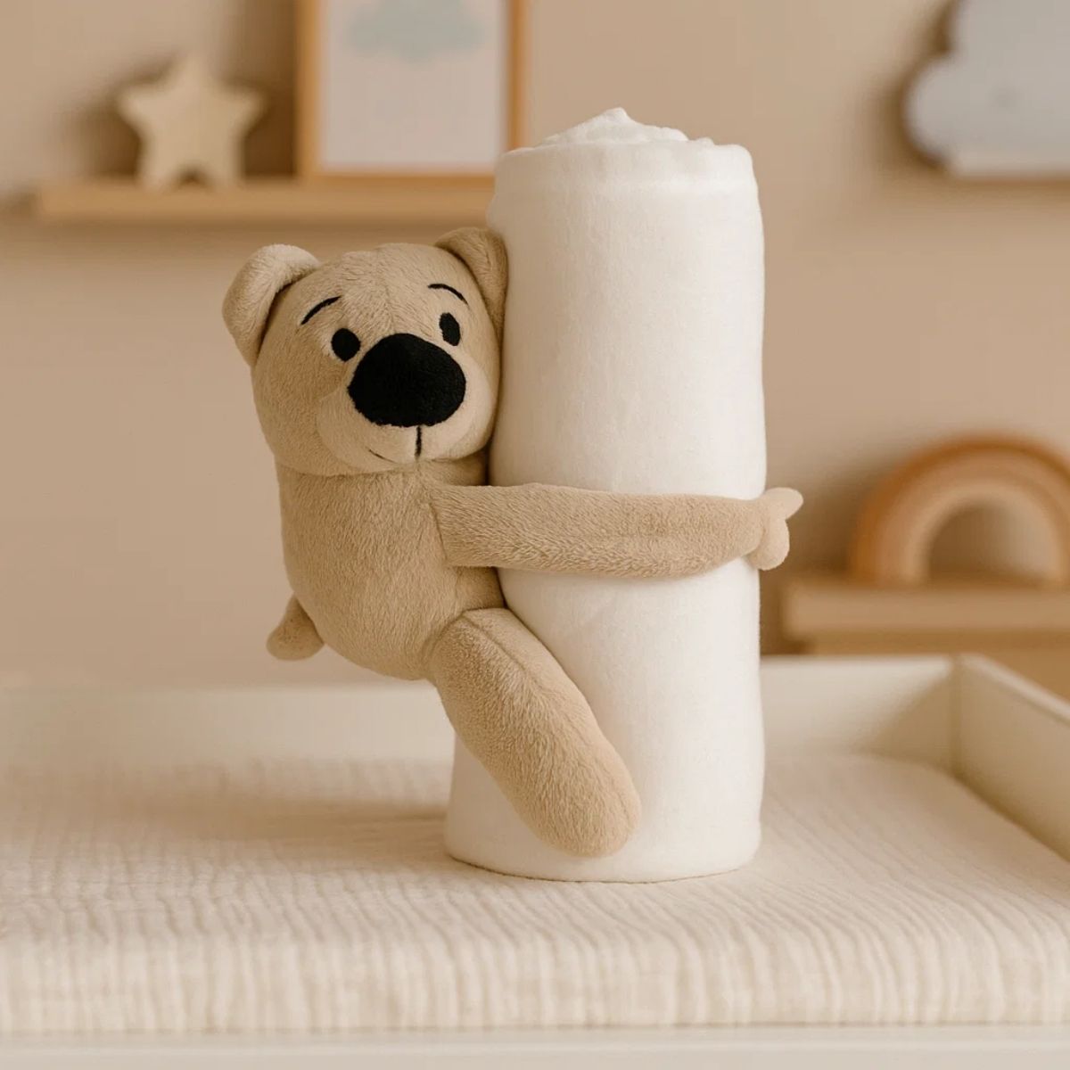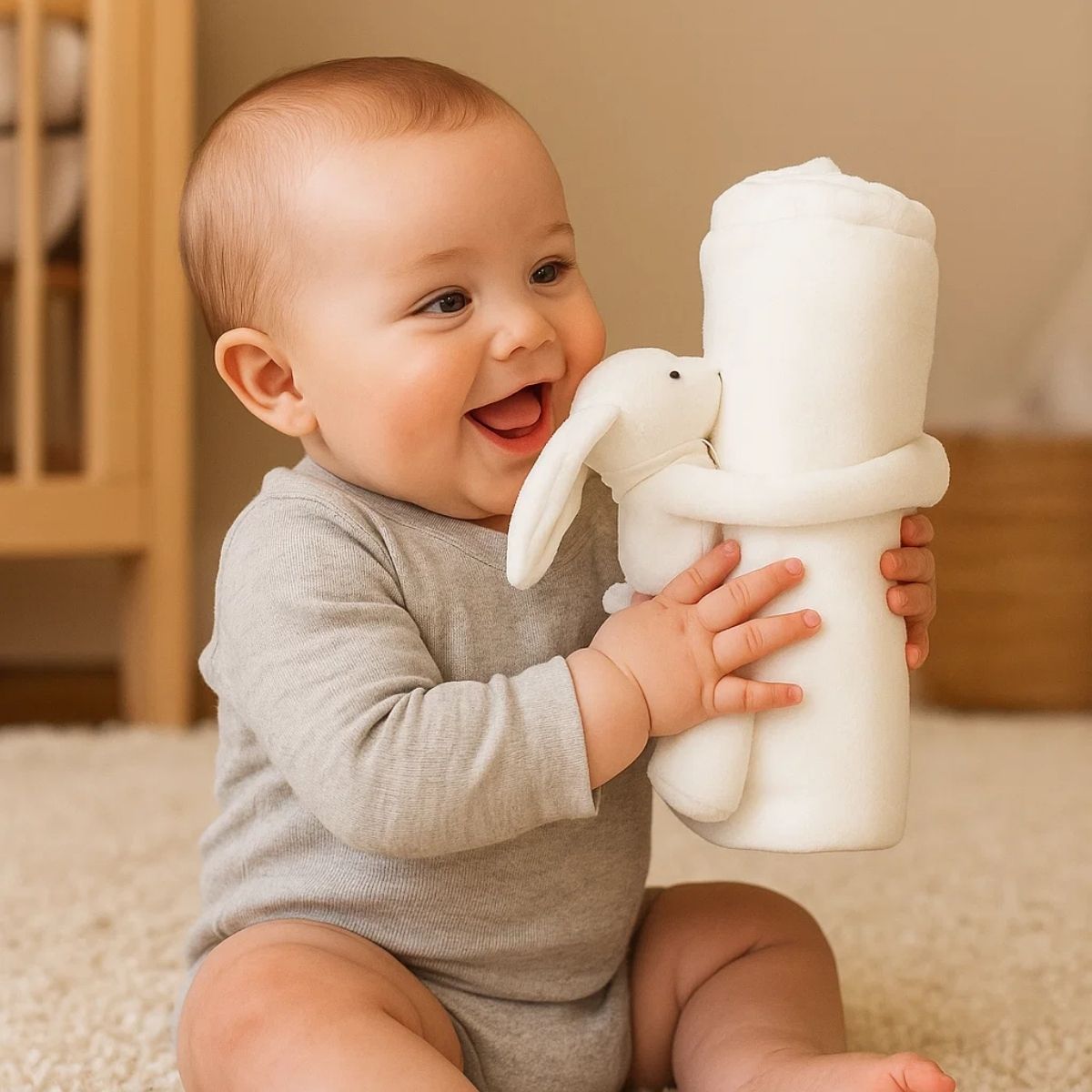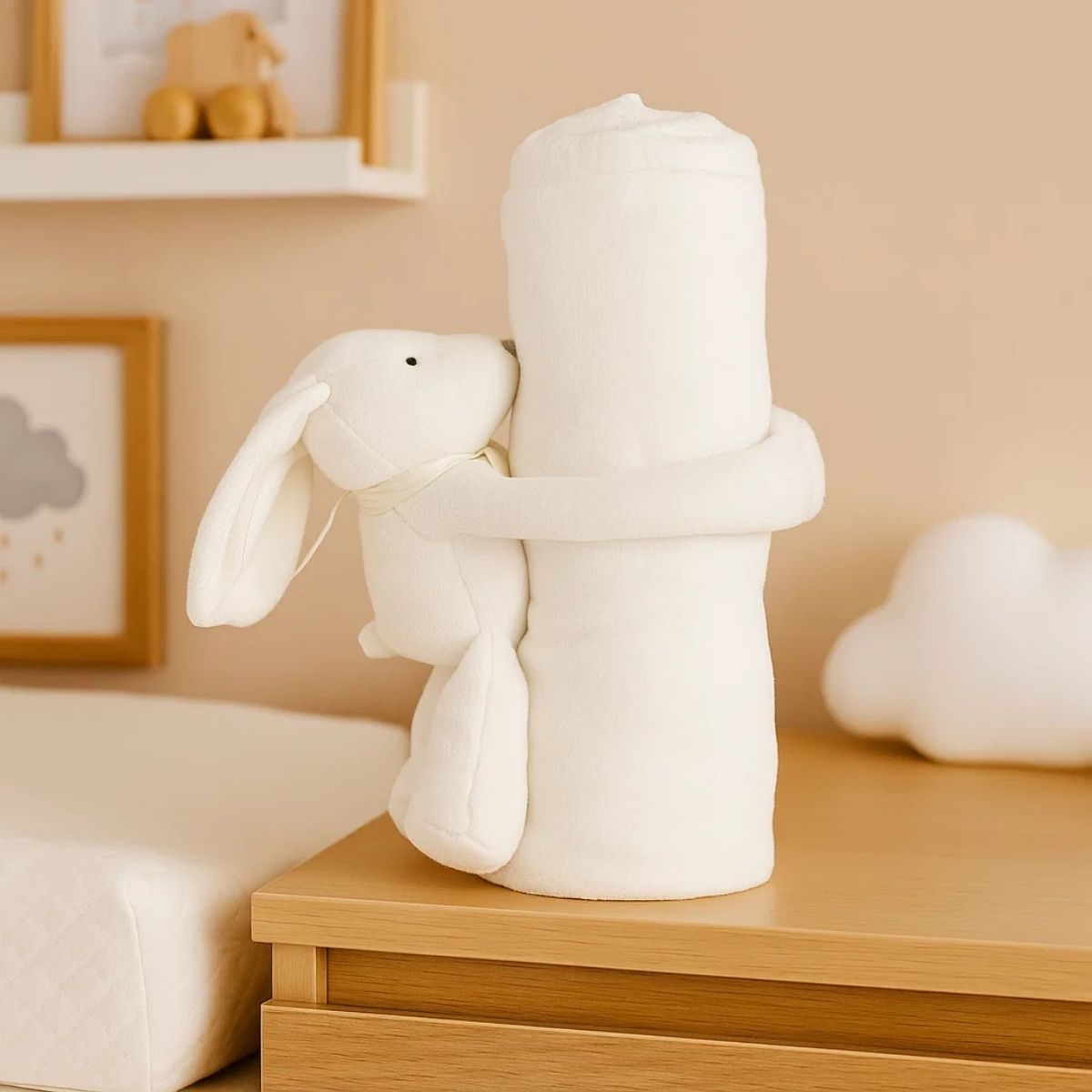 Además, la manta incluye un peluche a juego de 20 cm, que puedes elegir entre un osito tierno o un simpático conejo. Ambos están confeccionados en materiales suaves y agradables, perfectos para abrazar y acompañar al bebé desde sus primeros días. El conjunto manta + peluche crea un set adorable y muy completo, ideal tanto para uso diario como para decorar la habitación infantil.