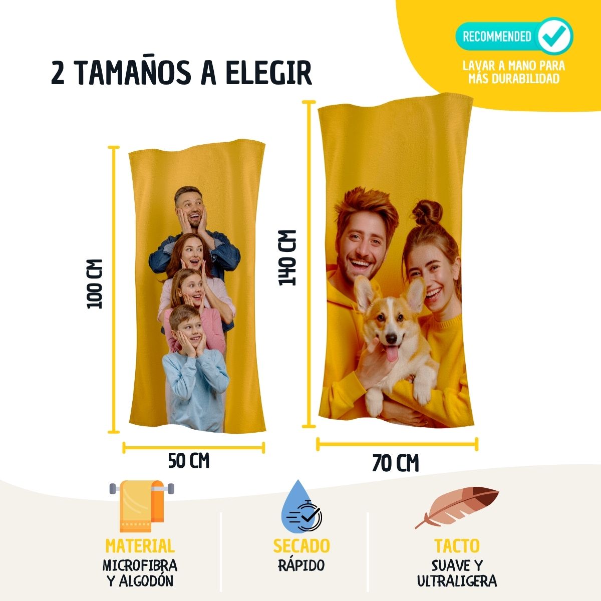 Dos tamaños disponibles: Puedes elegir entre dos formatos (50×100 cm y 70×140 cm), ambos fácilmente plegables y perfectos para transportar en mochilas o maletas. Su peso ligero (400 g/m²) facilita su uso diario y viajes sin ocupar espacio innecesario.